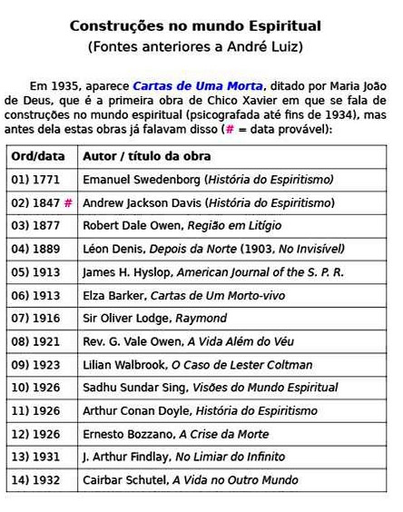 As obras dessa lista fazem parte das 39 fontes nas quais há referências à construções no plano espiritual. Número significativo, considerando que em relação à elaboração do conteúdo da primeira edição de O Livro dos Espíritos o Codificador literalmente disse: “[…] Foi assim que mais de dez médiuns prestaram concurso a este trabalho” ([4]).